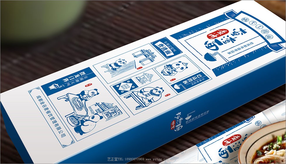 包装为了让消费者更便于携带,采用了长方形礼盒作为外包装,看起来精致高端,适合拿来送礼,内包装用挂面包装常见的捆扎方式将面条包裹起来,调料包单独包装,食用时卫生方便。在外包装图案设计上,以突出成都这个城市的文化特色为主,将其融入到包装的内涵中。在包装图中可以看到,两种产品的包装分别为红色和蓝色,几个插画中分别以锦里和宽窄巷子为背景,将憨态可掬的大熊猫形象拟人化,穿着厨师的衣服揉面、挂面、煮面、吃面,生动形象,非常可爱。产品广告语为“把成都的味道带回家”,意为将成都渣渣面带给外地游客,让游客及家人也可以品尝到成都的美味。