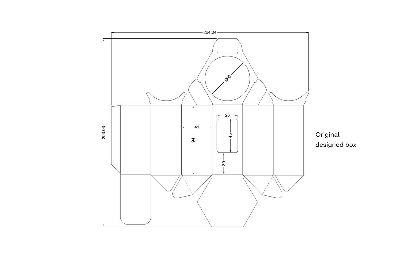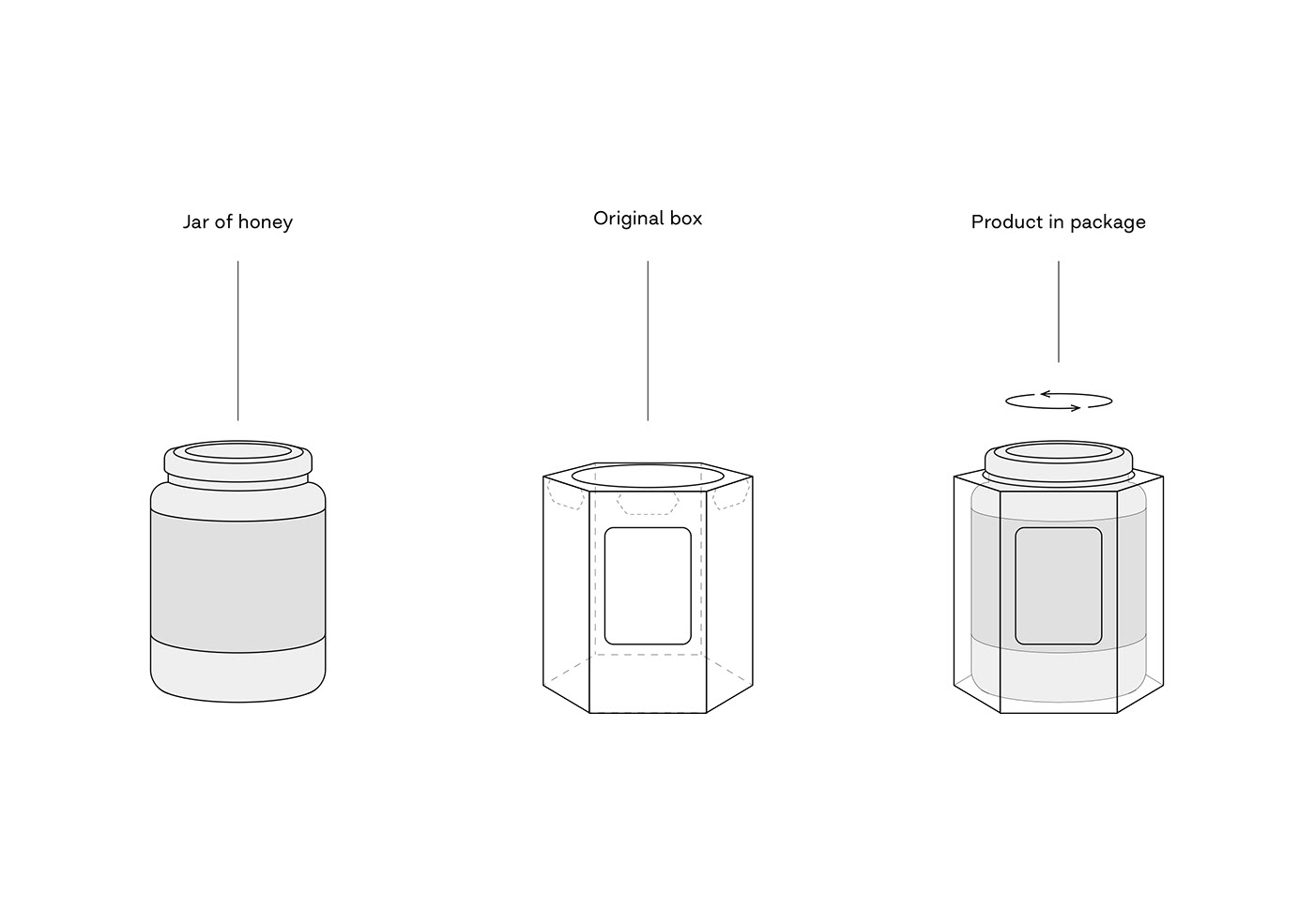 我们设计了盒子的草图。基础的形式是一个蜂巢的形象(六边形)。草图完成后,我们开始图纸、插画和布局设计。
