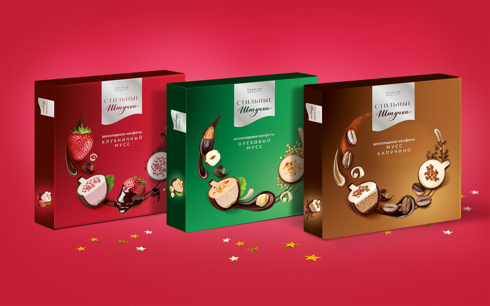 我们决定,在“Stolichniye Shtuchki”品牌下,重新进行两种食品的包装设计:盒装巧克力和牛轧糖。