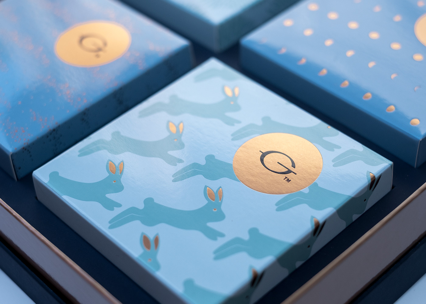 礼盒以繁星、明月、玉兔为元素,礼盒扣以金属材质衬托明月光辉。