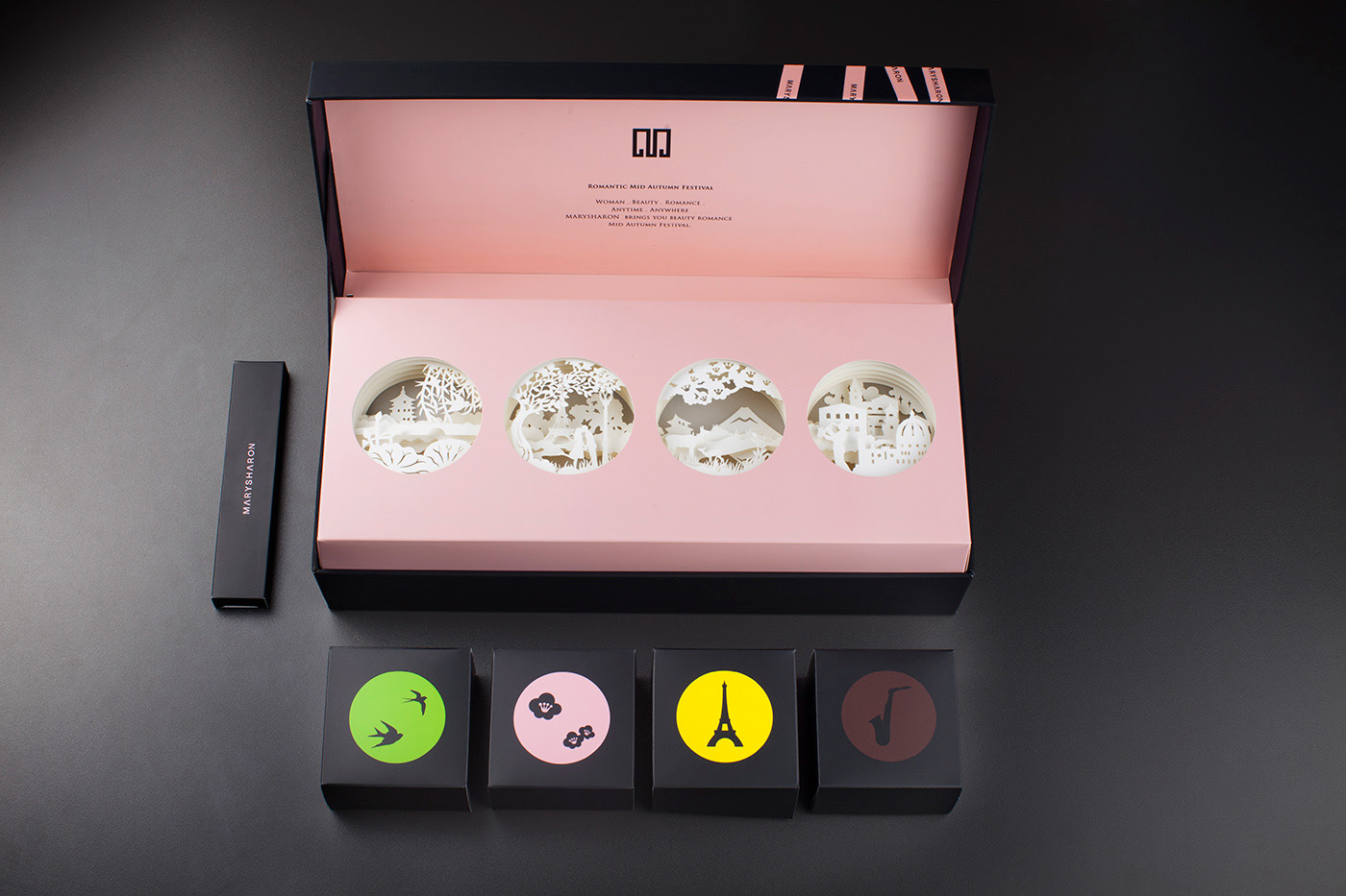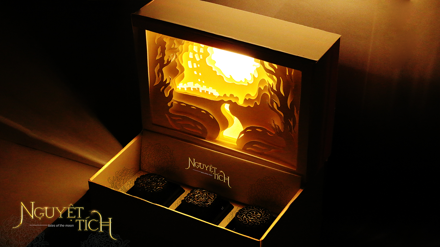 月亮以其神奇的力量和美丽庄严地统治着夜晚。我们用一种叫做“透视灯箱”的艺术来表现月光的本质。一层一层的纸张被切割下来,精细地粘在一起,以创造出层层叠叠的效果,就像一条发光二极管在后面发光一样。它创造了一种巨大空间和明亮的月亮照耀景观的光学效果。我们的品牌颜色是橘黄色的盒子,非常符合中秋节的精神。